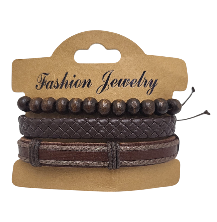 Przedstawiamy Państwu zestaw regulowanych trzech stylowych bransoletek wykonanych z ekologicznie wytworzonej skóry PU + drewnianych koralików.