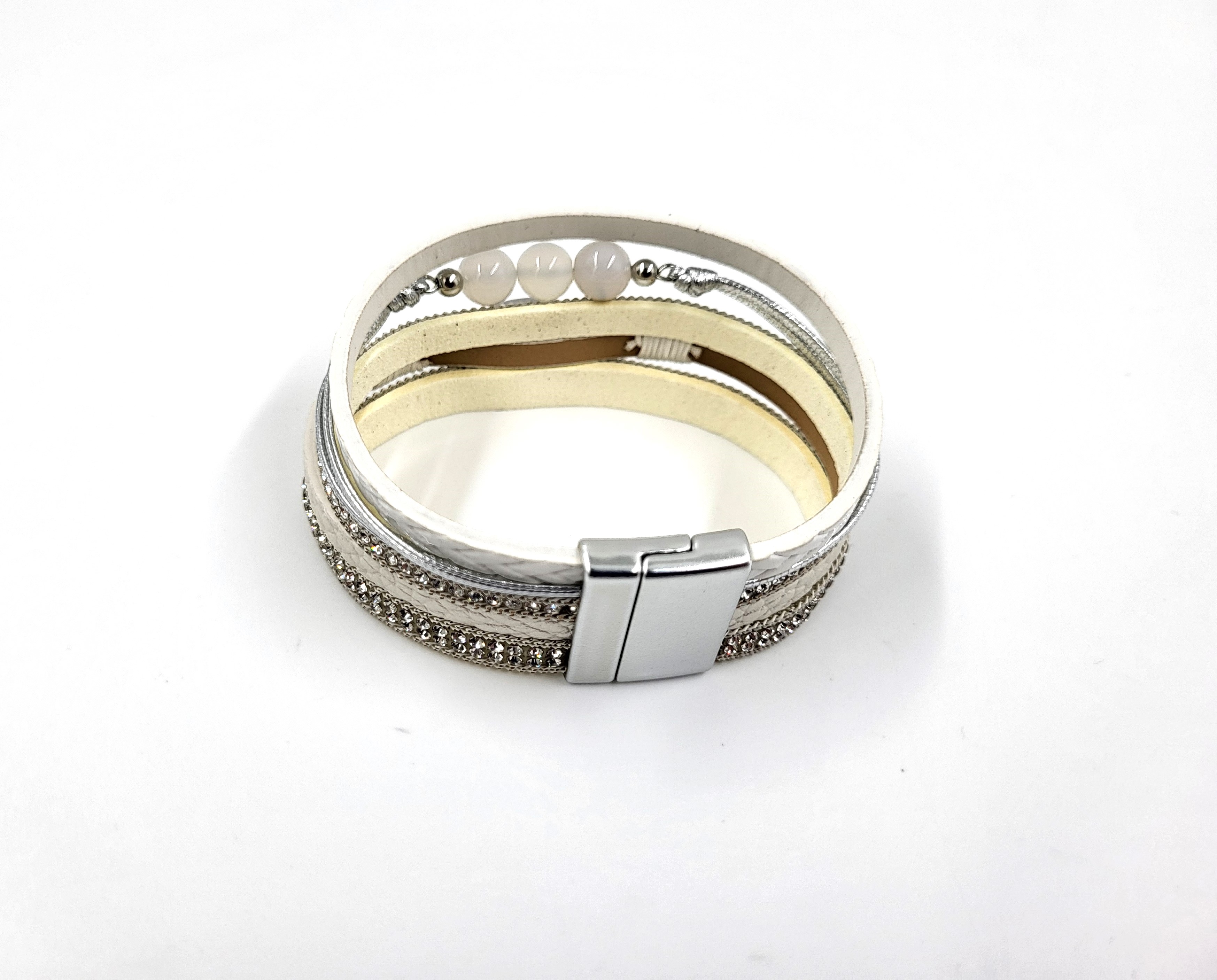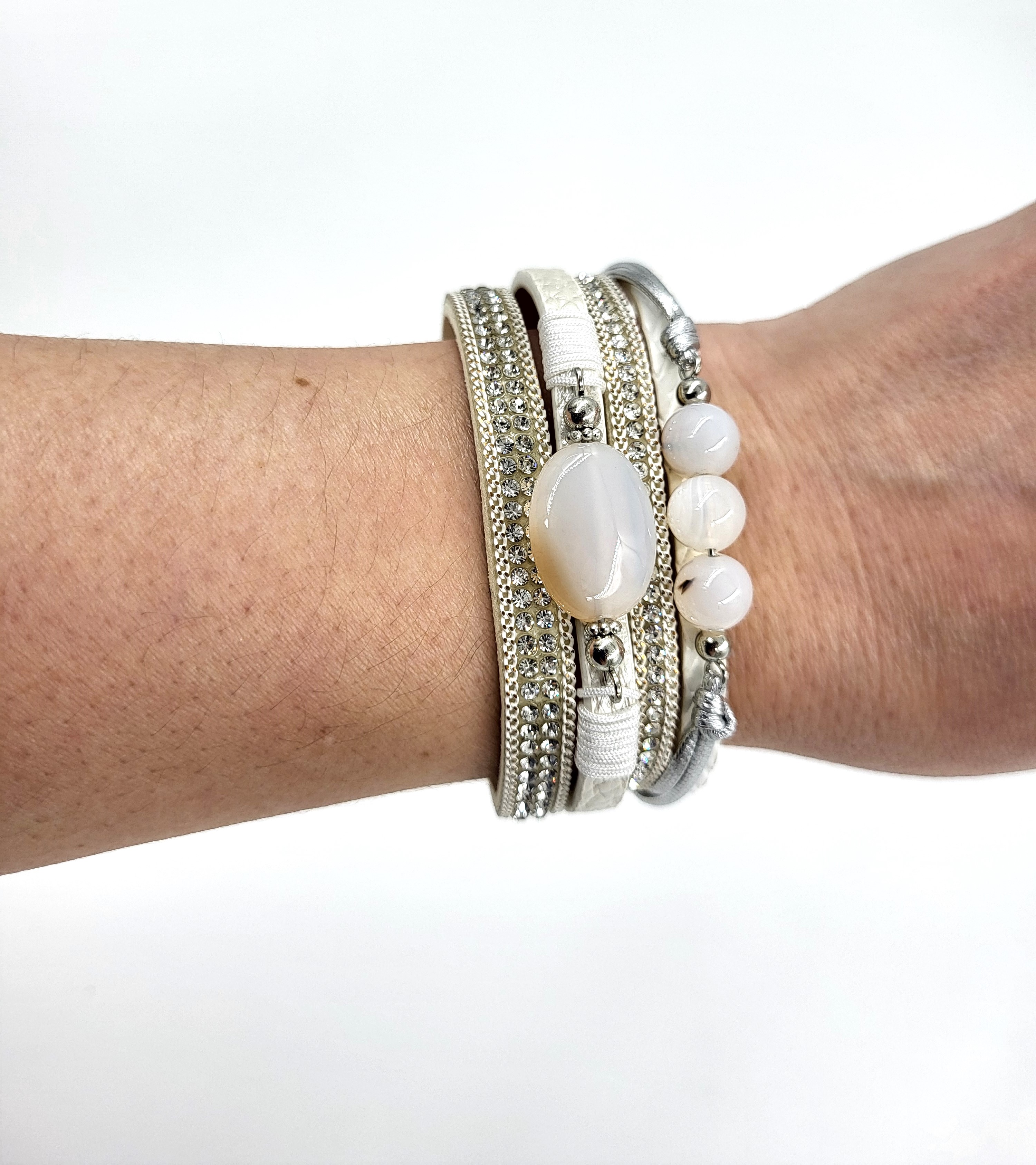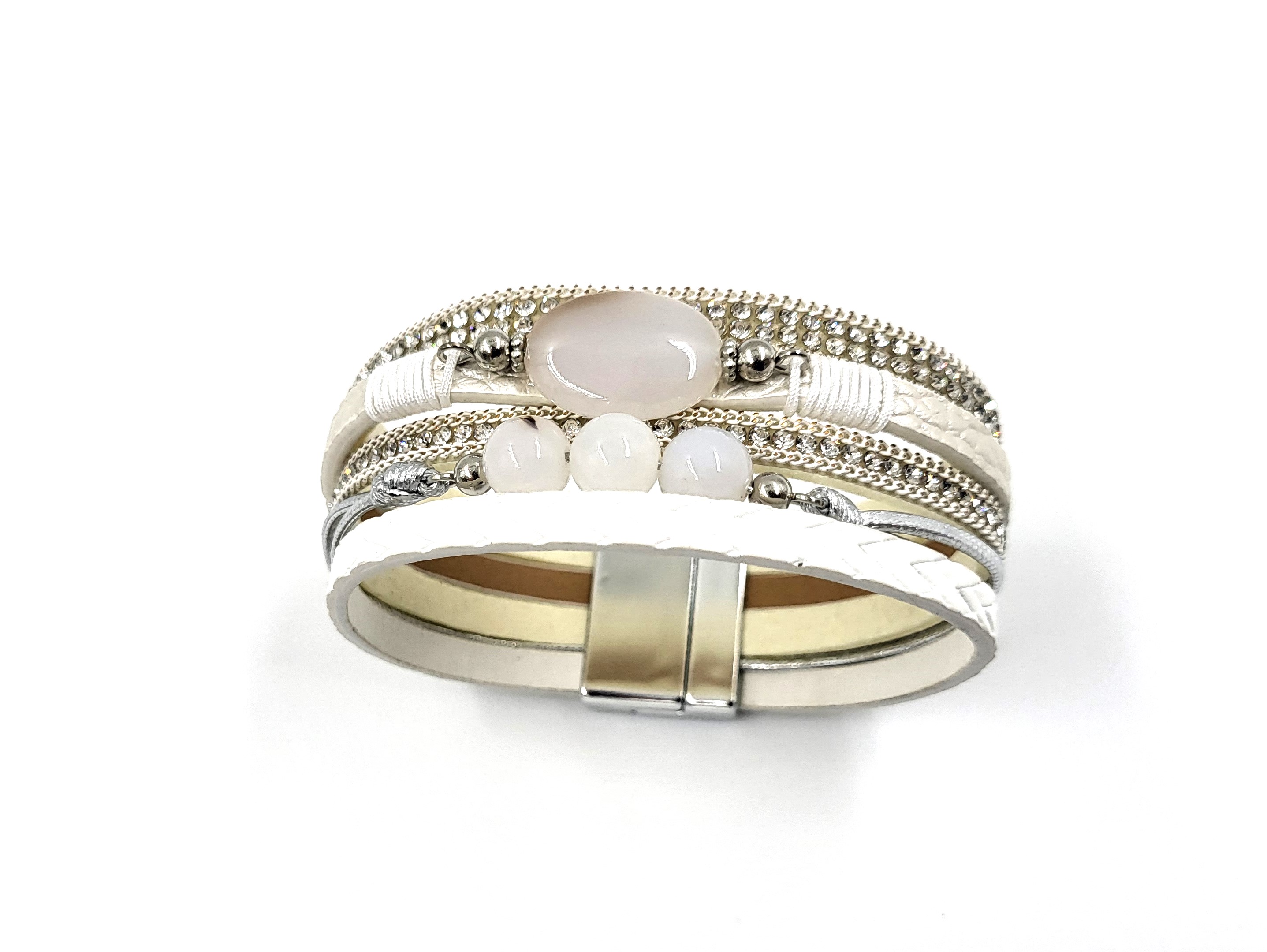 Modna bransoletka owijka ze skóry w odcieniach bieli . Składa się z pięciu elementów, które razem tworzą szeroką bransoletę. Ozdobiona cyrkoniami i kamieniami. Bransoletkę zapina się na magnetyczny zamek z metalu w kolorze złotym. Po środku przymosowany krzyzyk ozdobiony cyrkonimi. Modny dodatek w stylu boho.