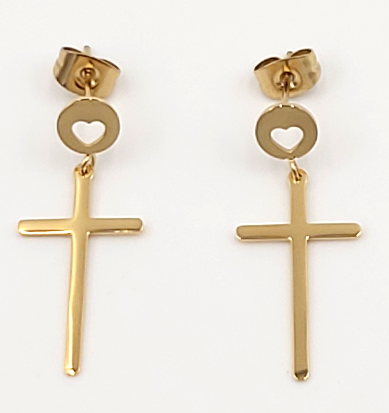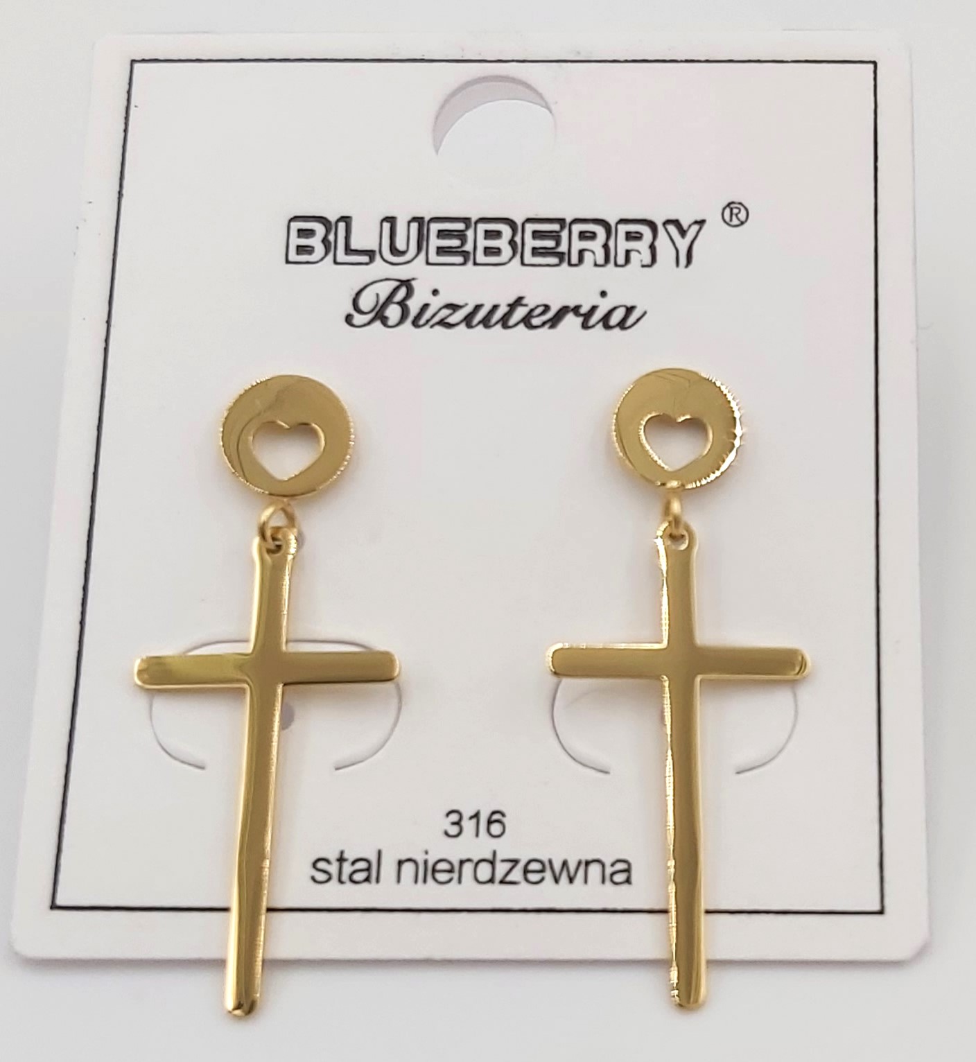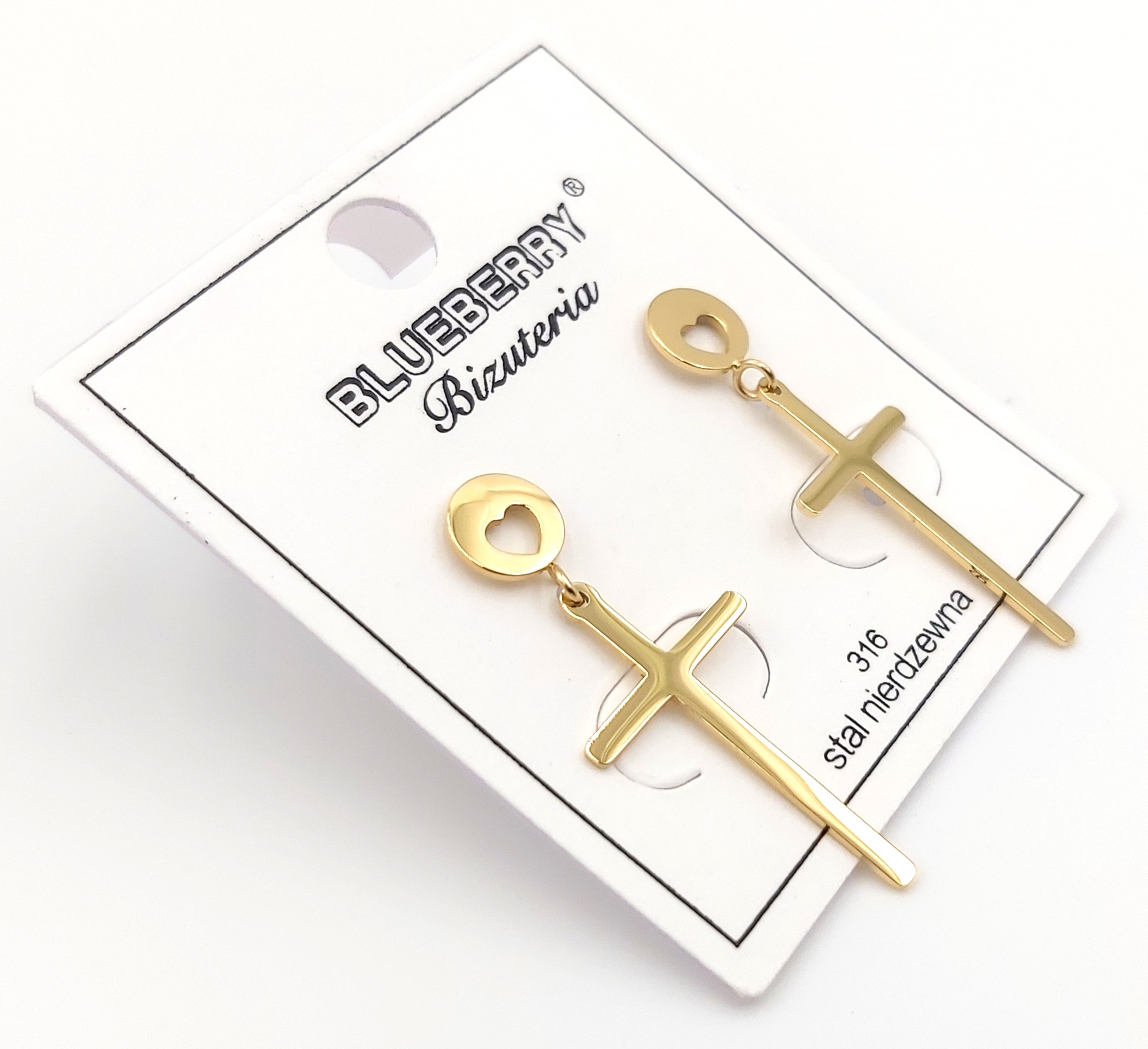 Kolczyki krzyzyk z serduszkiem firmy BLUEBERRY wykonane z wysokiej jakości stali nierdzewnej 316L.