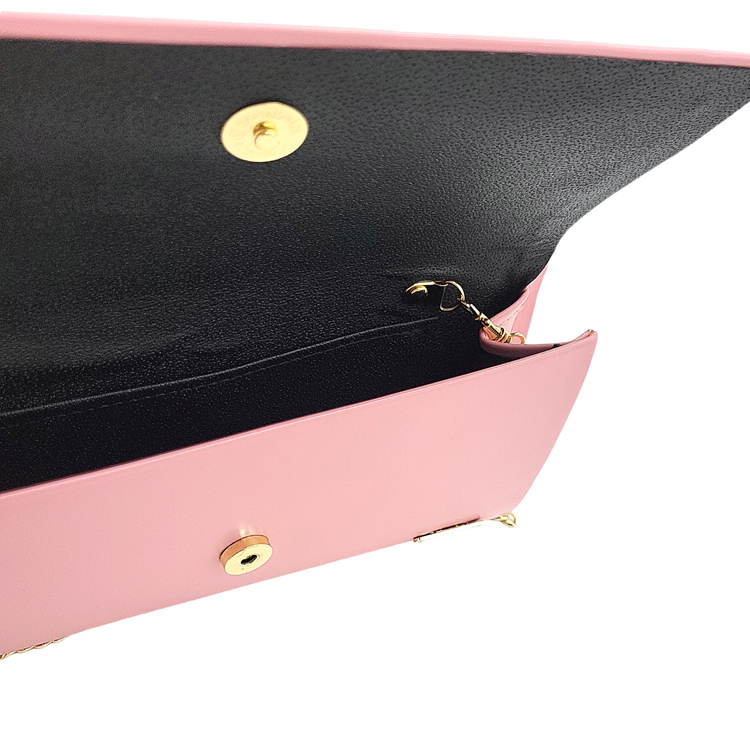 Piękna wizytowa torebka w klasycznym kolorze to idealny dodatek na wyjątkowe okazje, np. wesele, komunię czy przyjęcie.W środku torebki kieszonka na niezbędne drobiazgi. Torebka zamykana jest klapką na magnes.Z przodu torebki logo marki w kolorze złotym.Dopinany łańcuszek w kolorze złotym.