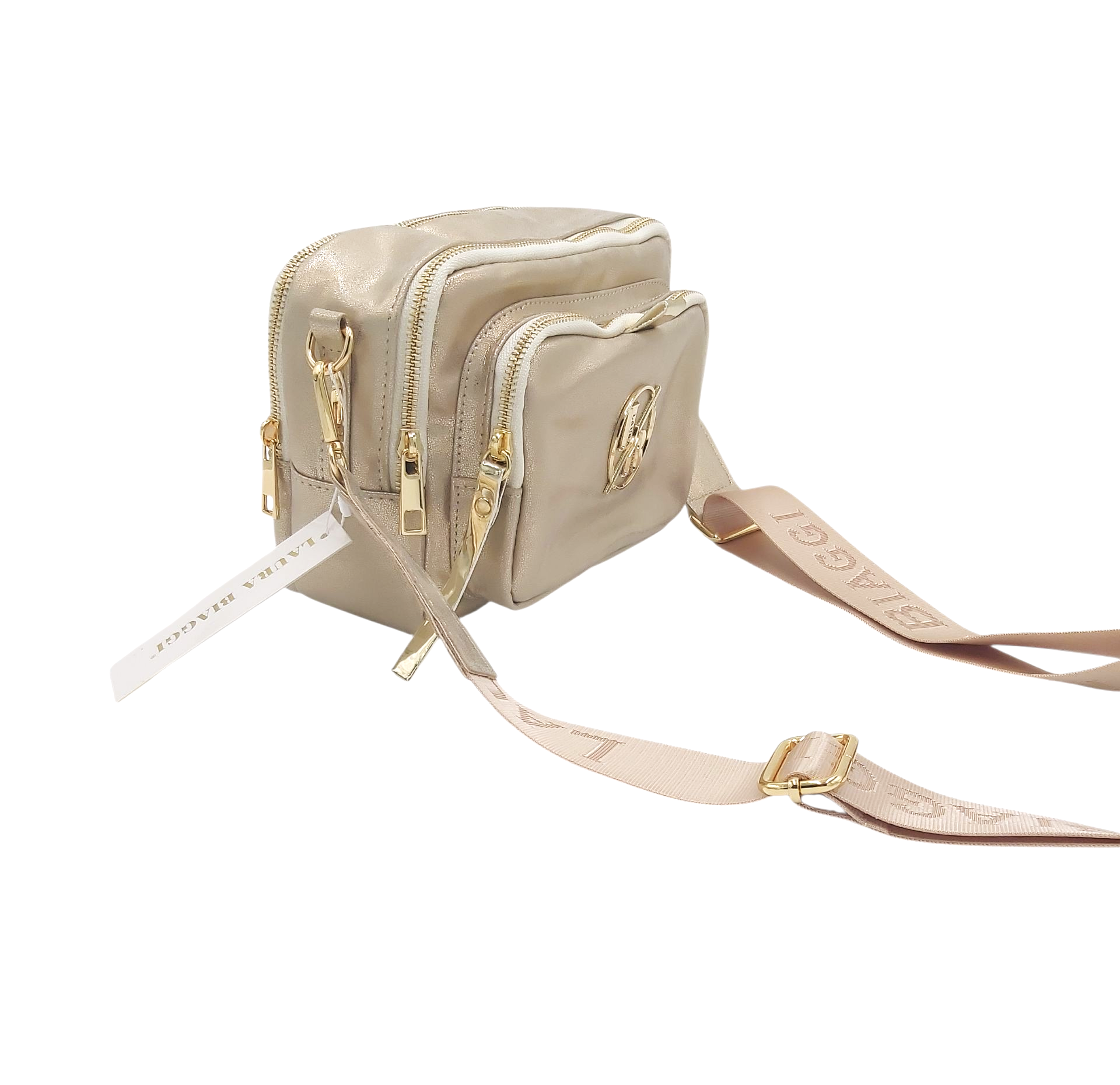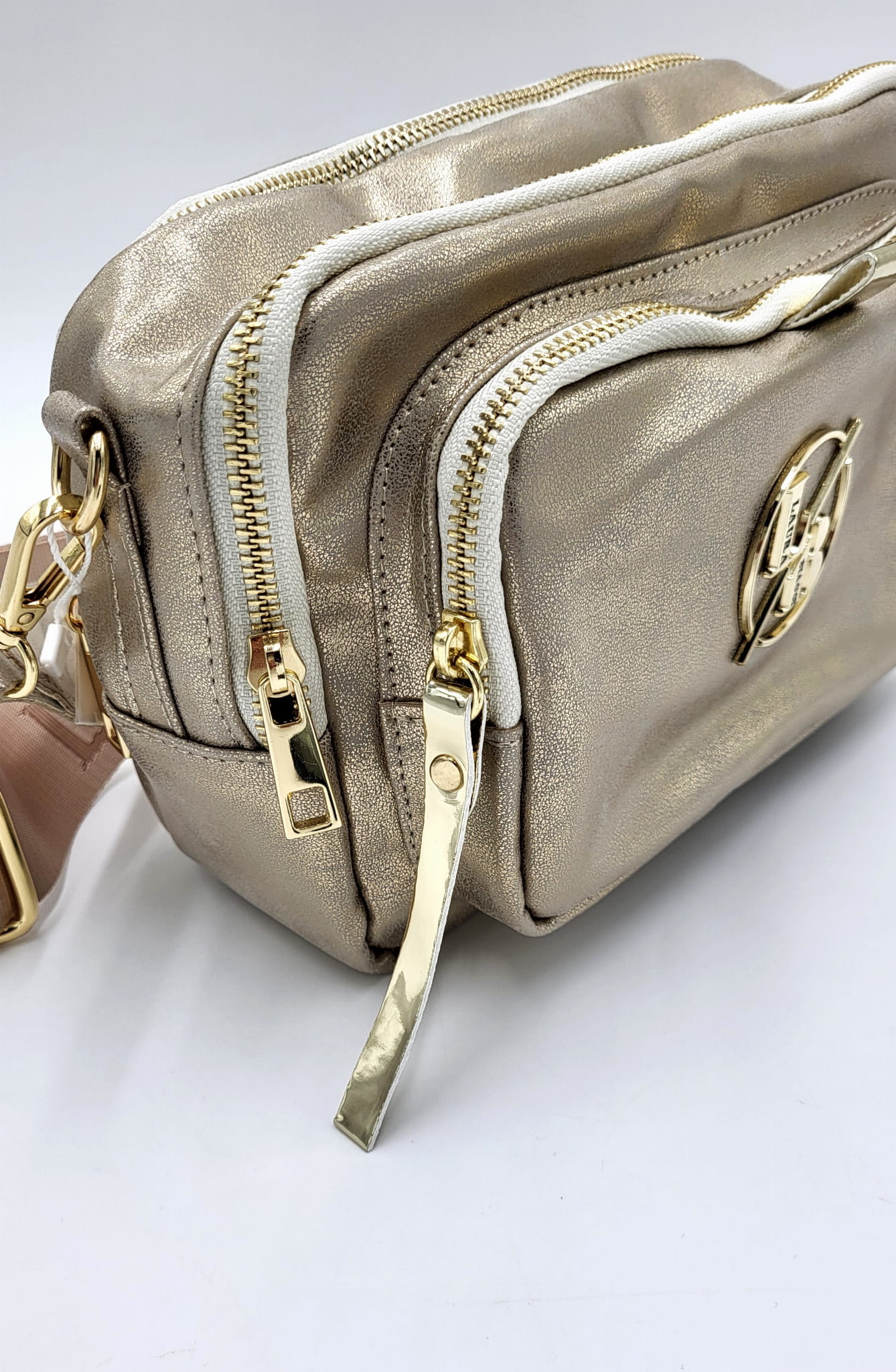 Torebka wyróżnia się prostym kształtem i niewielkim rozmiarem. Trzy osobne zasuwane komory sprawiają, że listonoszka jest niezwykle pojemna i z pewnością pomieści najpotrzebniejsze akcesoria każdej kobiety.Raportówka posiada szeroki regulowany, dopinany pasek dzięki któremu można ją nosić na ramieniu i przez ramię. Fakturę torebki urozmaicono złotymi okuciami, dodającymi odrobinę elegancji.