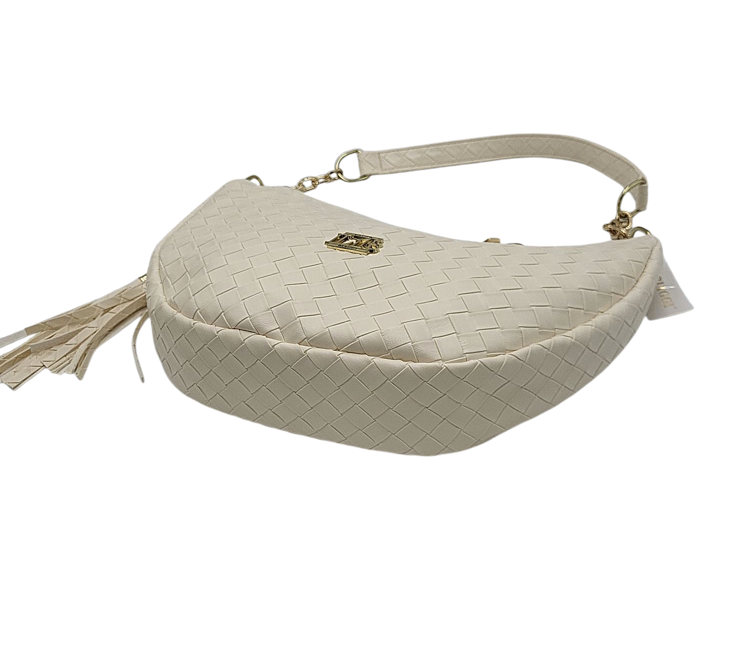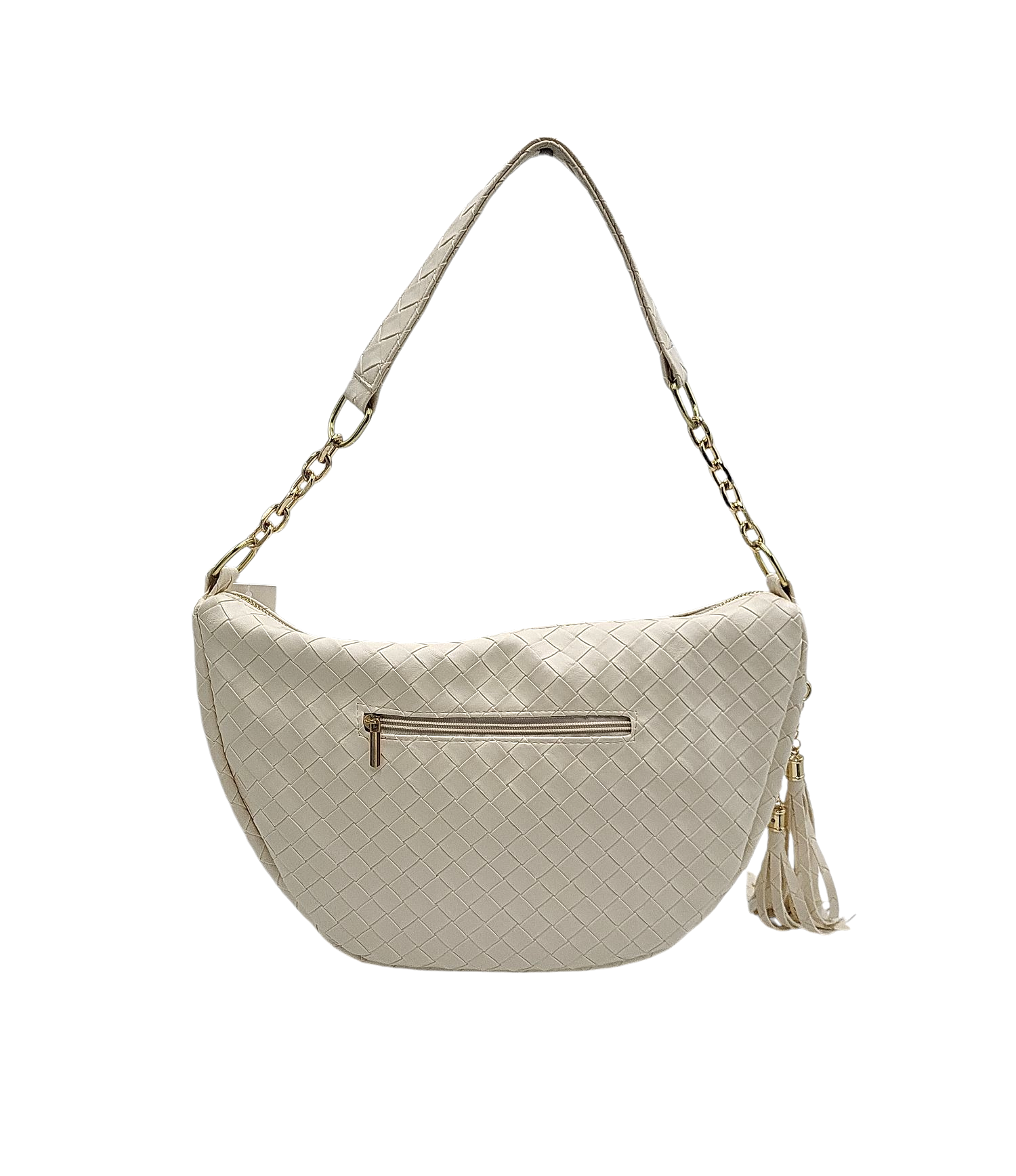 Torebka wykonana z wysokiej jakości materiału w plecioną kratkę w kolorze beżowym.
