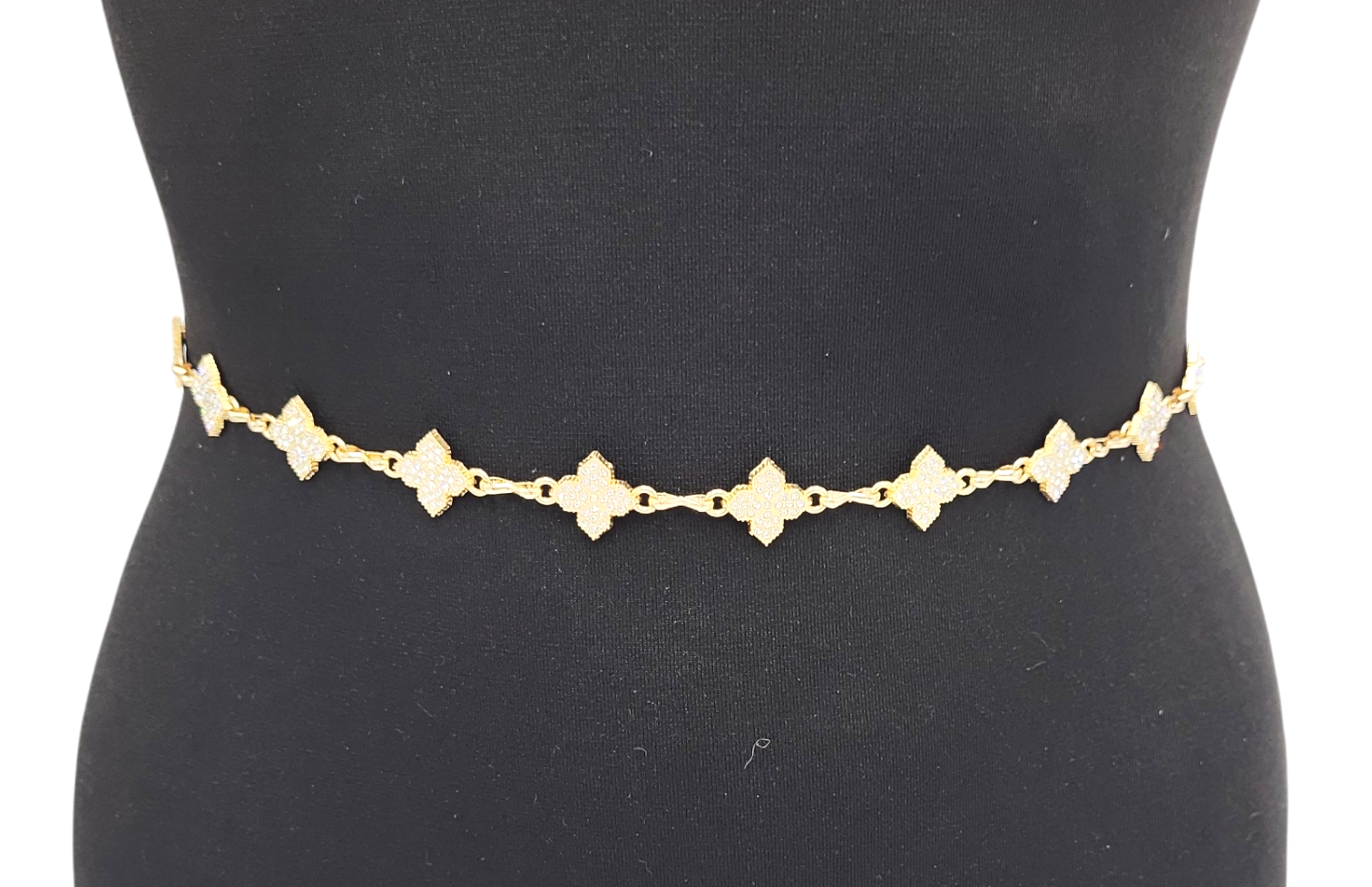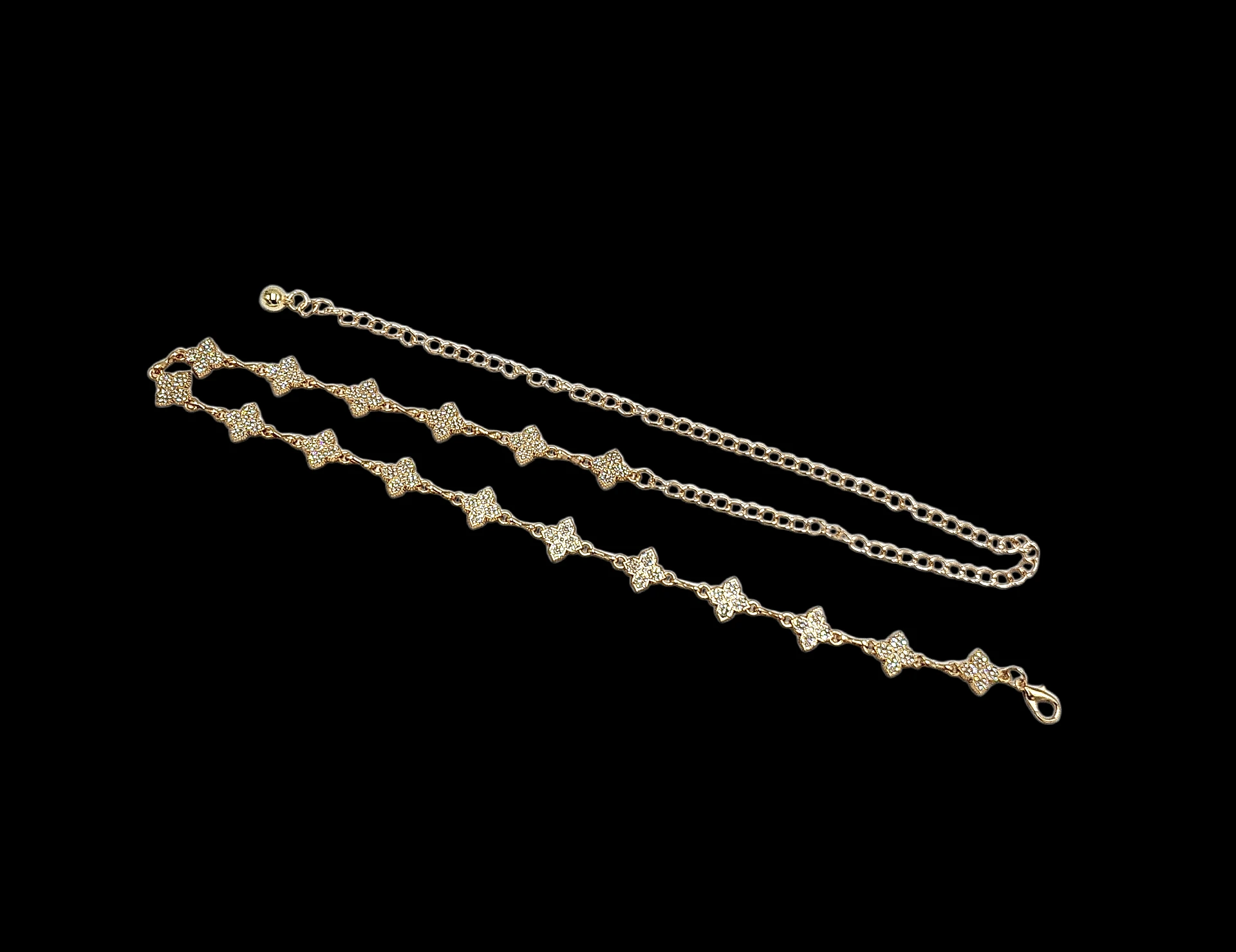 Elegancki pasek ozdobny damski z metalowym łańcuszkiem i cyrkoniami — subtelny dodatek, który podkreśli każdą stylizację. Wykonany z wysokiej jakości materiałów, łączy w sobie trwałość metalu z delikatnym blaskiem cyrkonii, tworząc efekt luksusu bez przesady. Złota tonacja nadaje całości klasyczny, ponadczasowy charakter, idealny do sukienek wieczorowych, eleganckich kompletów oraz modnych, codziennych zestawień.