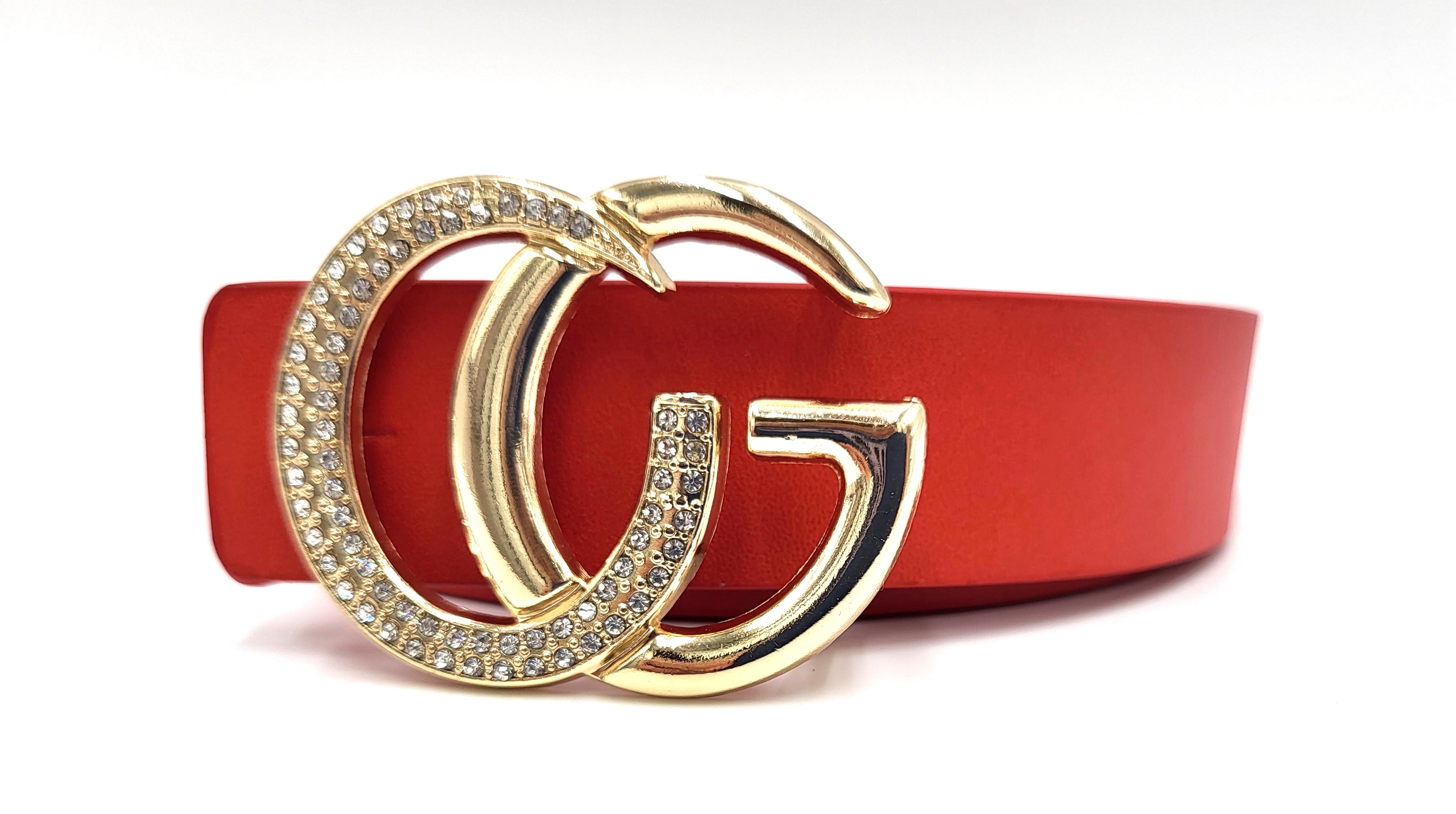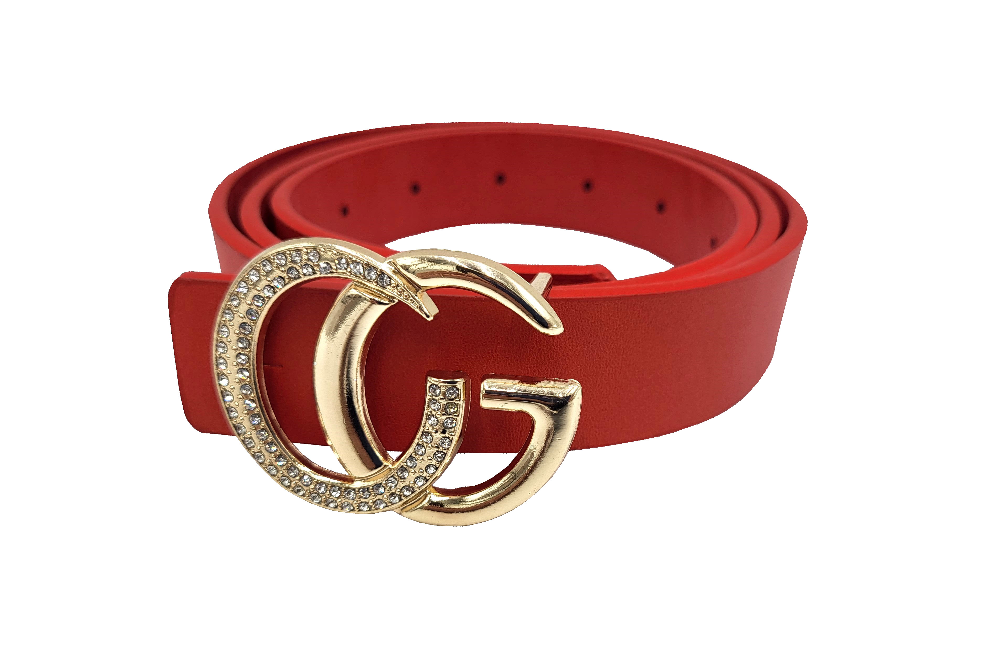 Czerwony pasek damski z klamrą w kolorze złotym, zdobiony cyrkoniami.