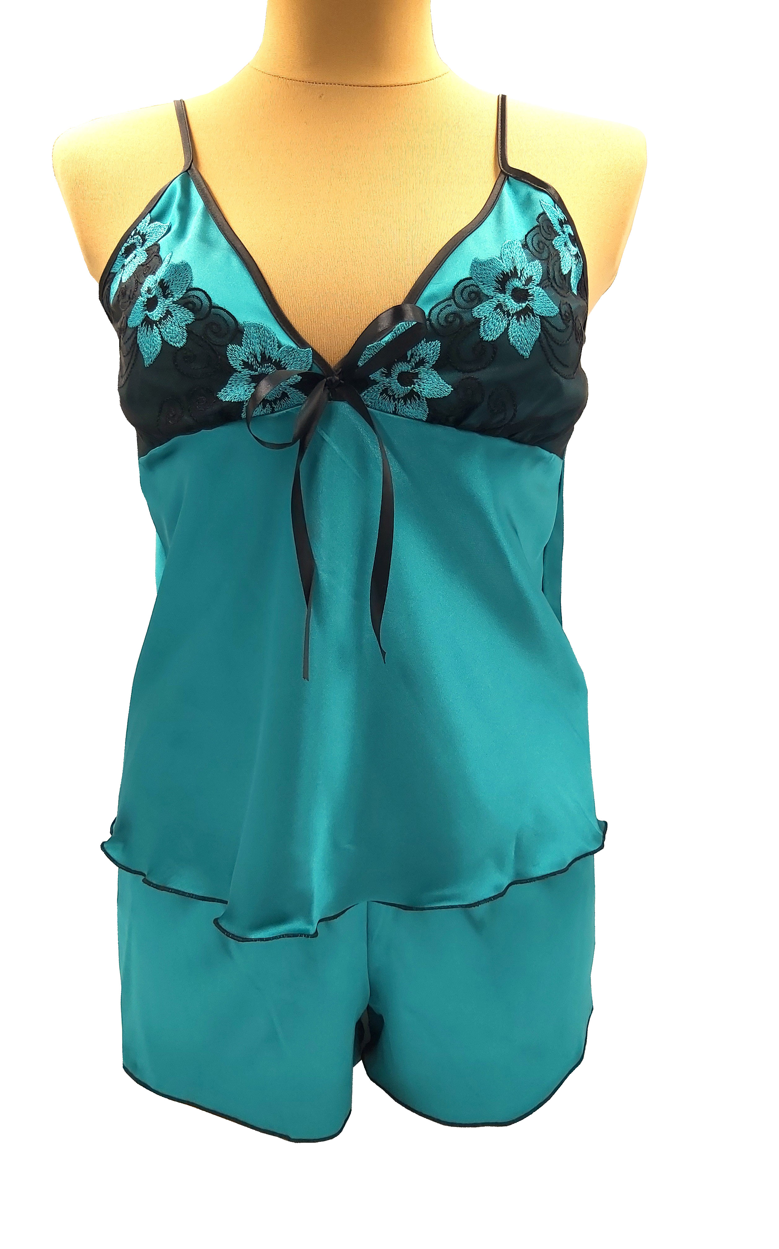 Śliczna piżamka z satyny, przy dekolcie wykończona delikatną koronkową wstawką. Lekka i przewiewna, miękka w dotyku, idealna na upalne, letnie noc.