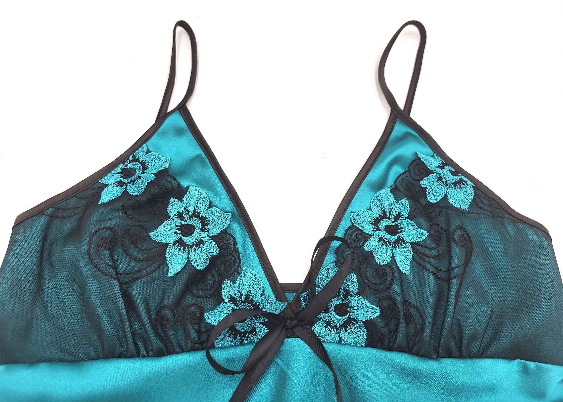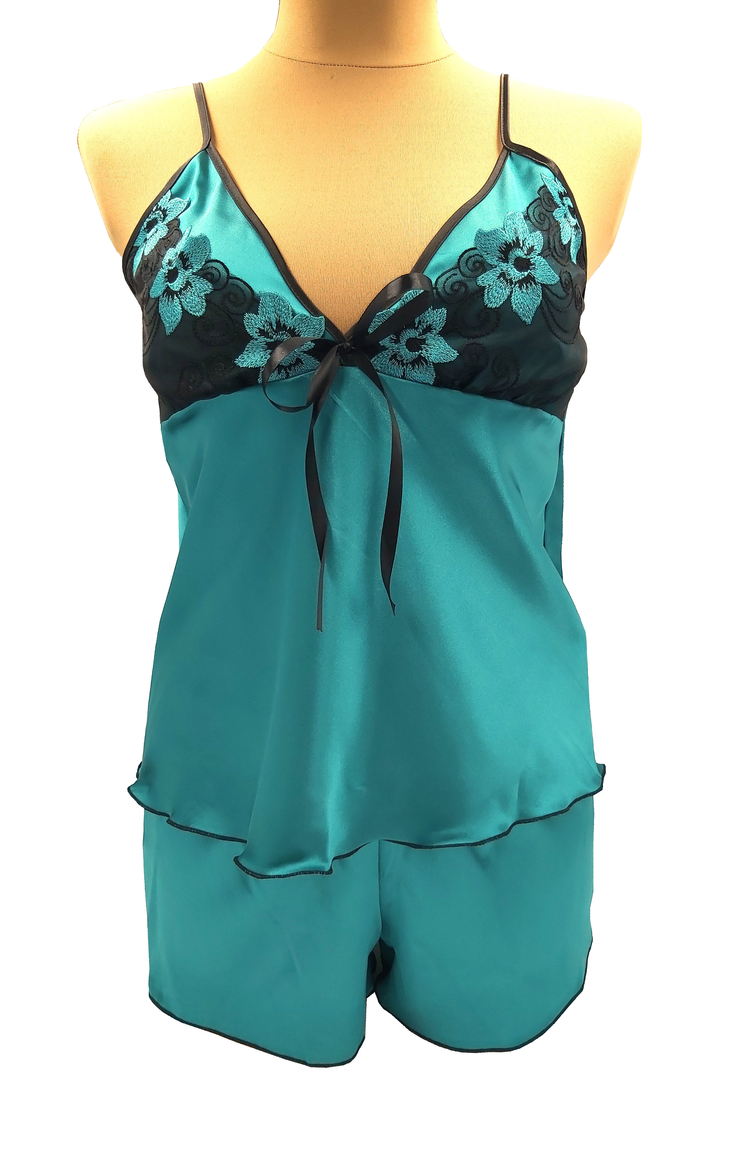 Śliczna piżamka z satyny, przy dekolcie wykończona delikatną koronkową wstawką. Lekka i przewiewna, miękka w dotyku, idealna na upalne, letnie noc.