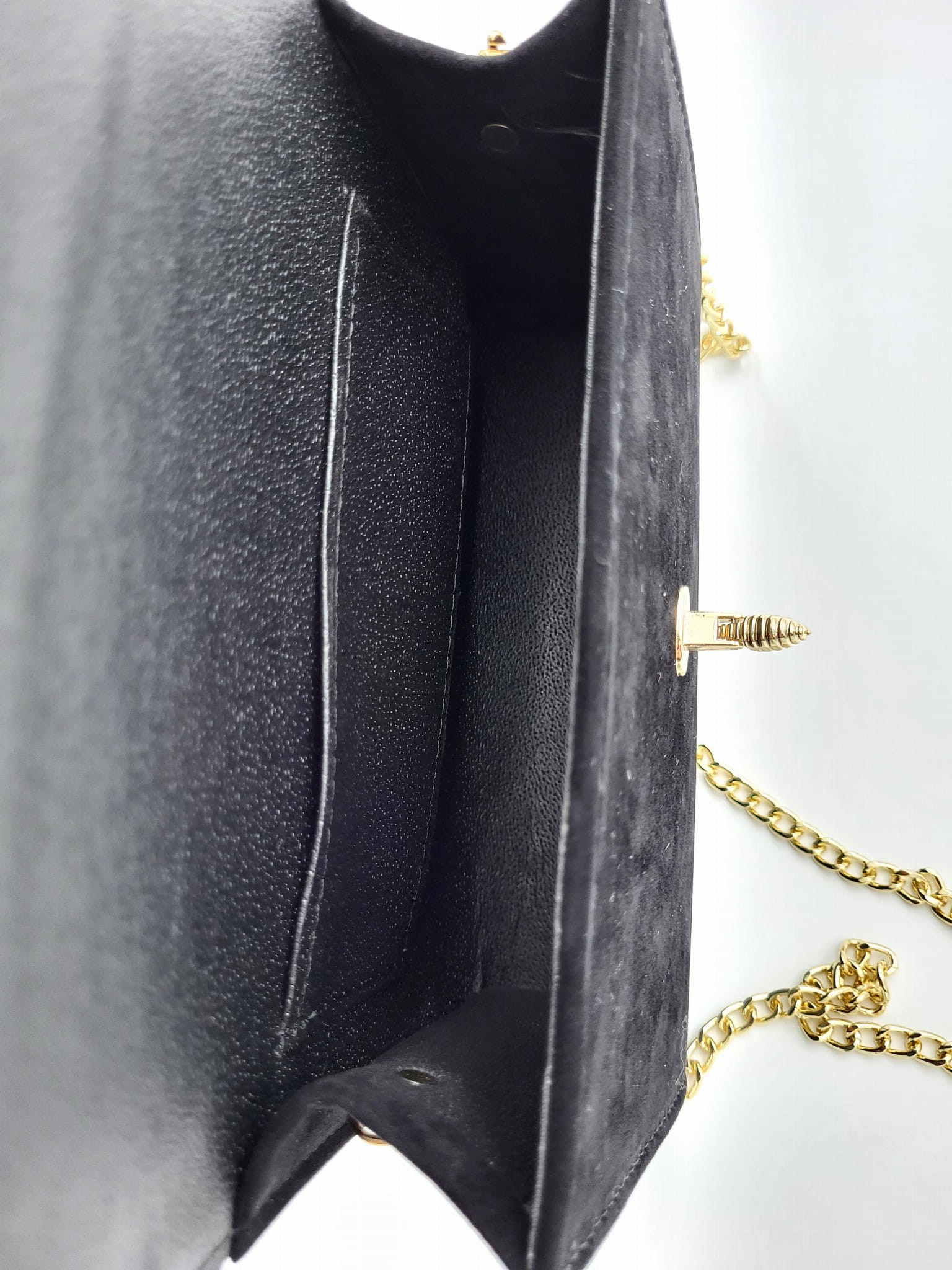 Torebka kopertówka w kolorze czarnym z ecozamszu doda szyku eleganckiej wieczorowej kreacji i podkreśli pewność siebie. Kopertówka pięknie wyeksponuje zadbane dłonie i paznokcie.