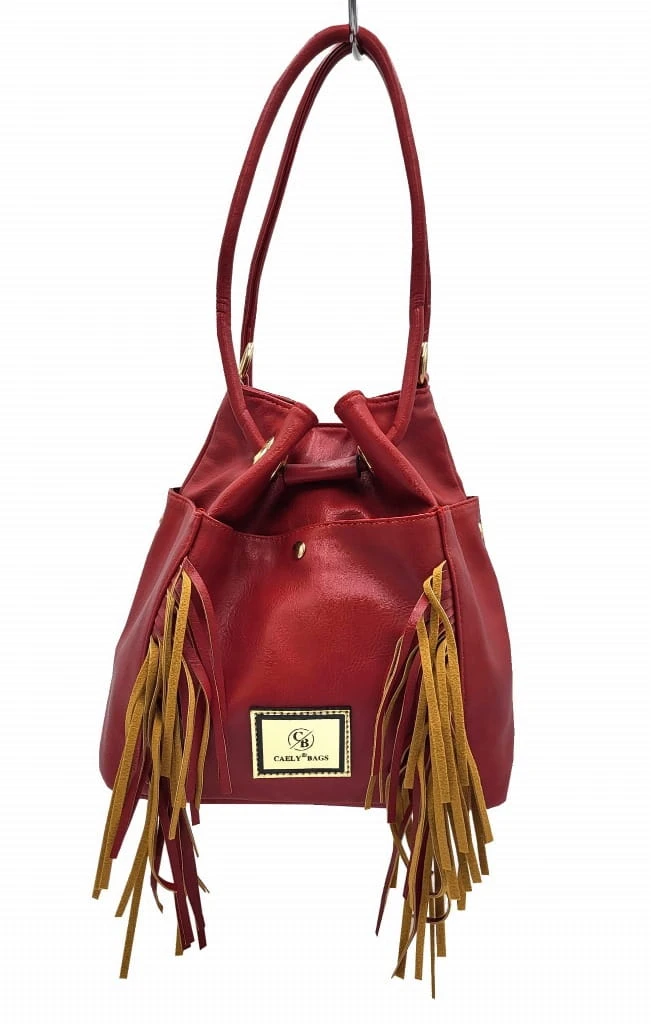 Przyciągający wzrok, modny i piękny model worka-torebki w kolorze czerwonym z frędzlami.