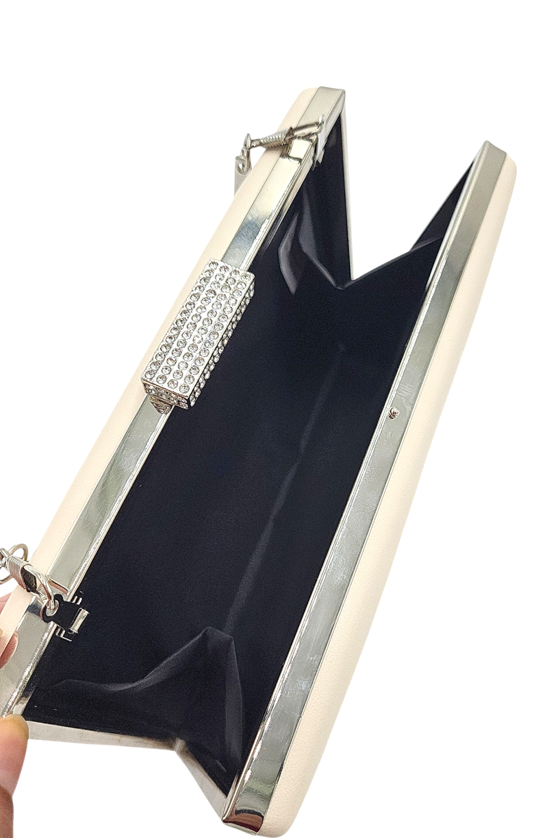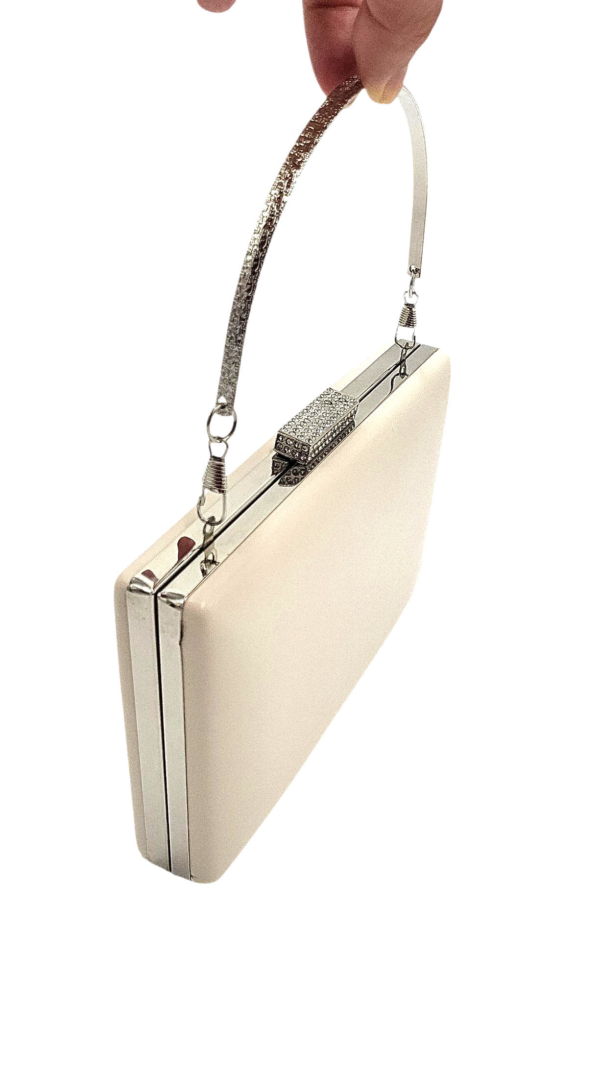Elegancka i stylowa damska torebka, idealna na specjalne okazje. Wykonana z wysokiej jakości materiałów, w kolorze beżowym ze srebrnymi dodatkami. Wnętrze wyłożone delikatną podszewką. Zapinana na zamek, zapewniający bezpieczeństwo Twoim osobistym przedmiotom. Niewielki rozmiar sprawia, że idealnie nadaje się na wieczorne wyjścia czy wesela, komunie. Dodaj szyku swojej stylizacji z tą wizytową torebką puzderkiem.