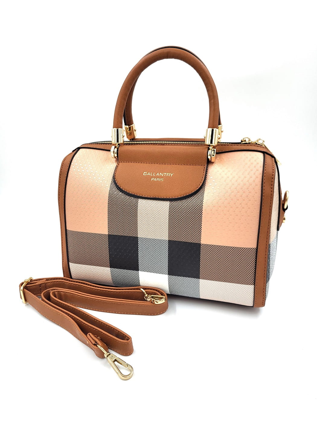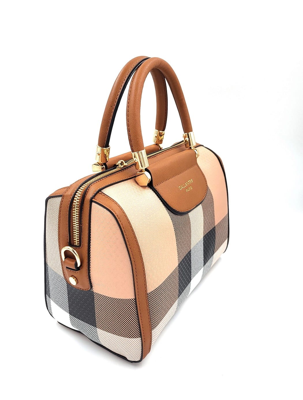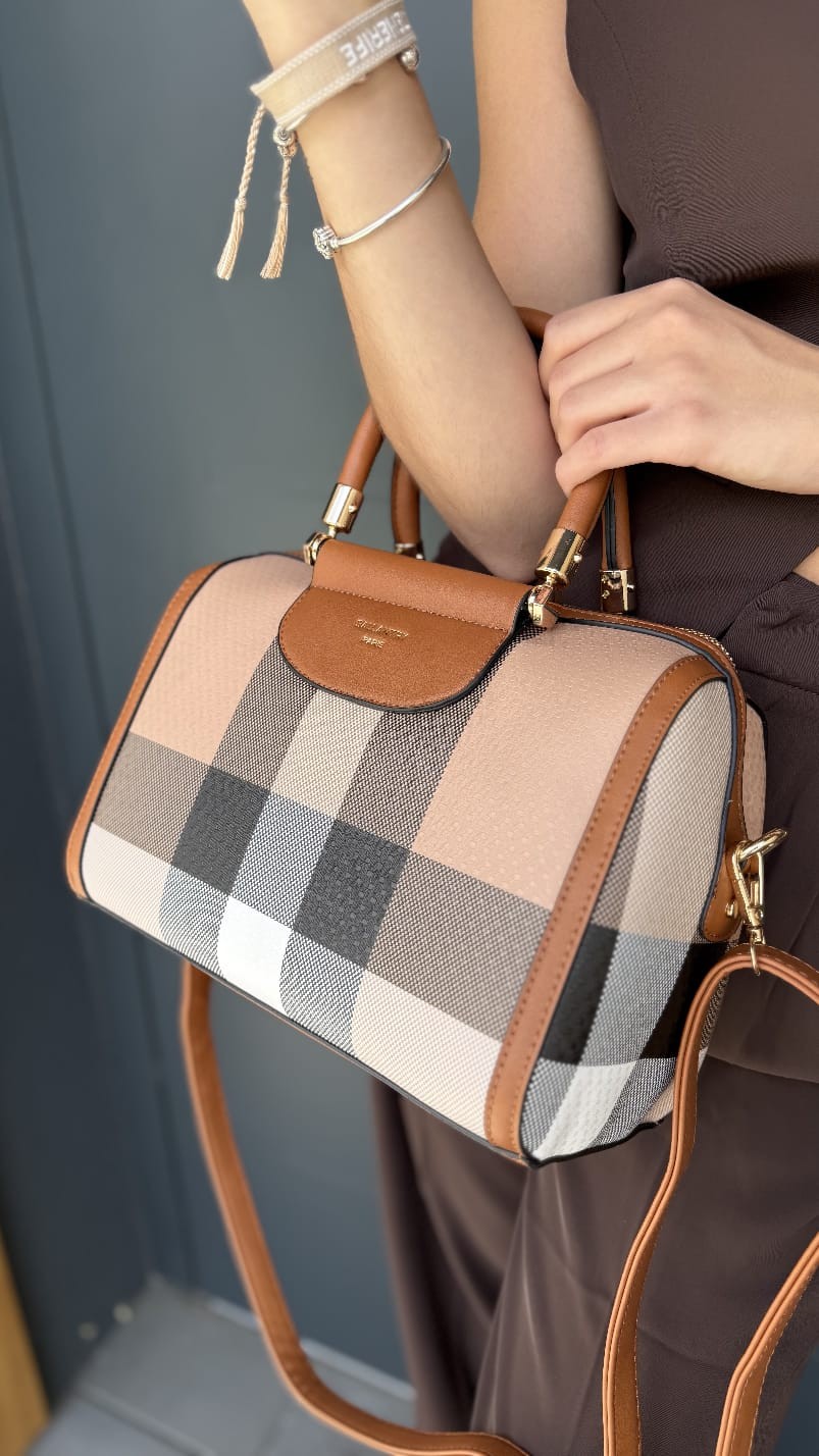 Śliczny kuferek w modną kratę w kolorach karmelu, beżu.